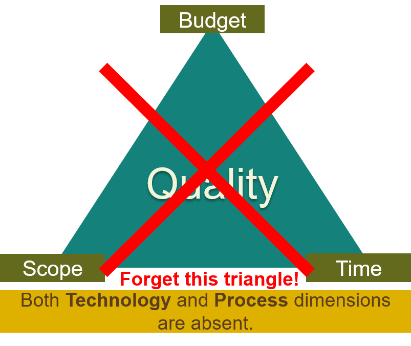 So, what makes all the difference? How can a company provide faster and smarter services with higher quality, AND be more cost-effective at the same time? What about the classic Triple Constraint of “time, budget and scope” that we all learned and naively believed at school? The answer is that the proposed constraint model either forgets about processes and technologies or assumes these two dimensions to be fixed variables. Smart companies, who tweak and optimize their processes and employ suitable technologies to support them (and vice versa), end up breaking that doomed triangle (see Figure 1).