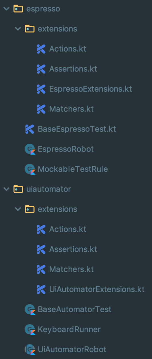 Functions are split into two main packages called espresso and uiautomator. Further, each package has an Actions.kt, Assertions.kt Matchers.kt and {library}Extensions.kt.