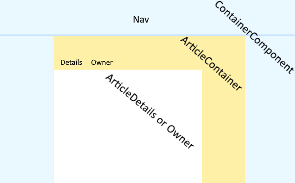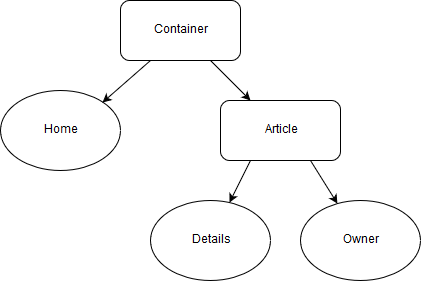 A global container is defined, ContainerComponent, which will be our parent Angular component for every page. It has two child routes (two pages): a home page and an article single page. Both pages are nested with the parent Angular component creating a hierarchical design. The article page defines one container component, ArticleContainerComponent, and two children: a details and an owner page.