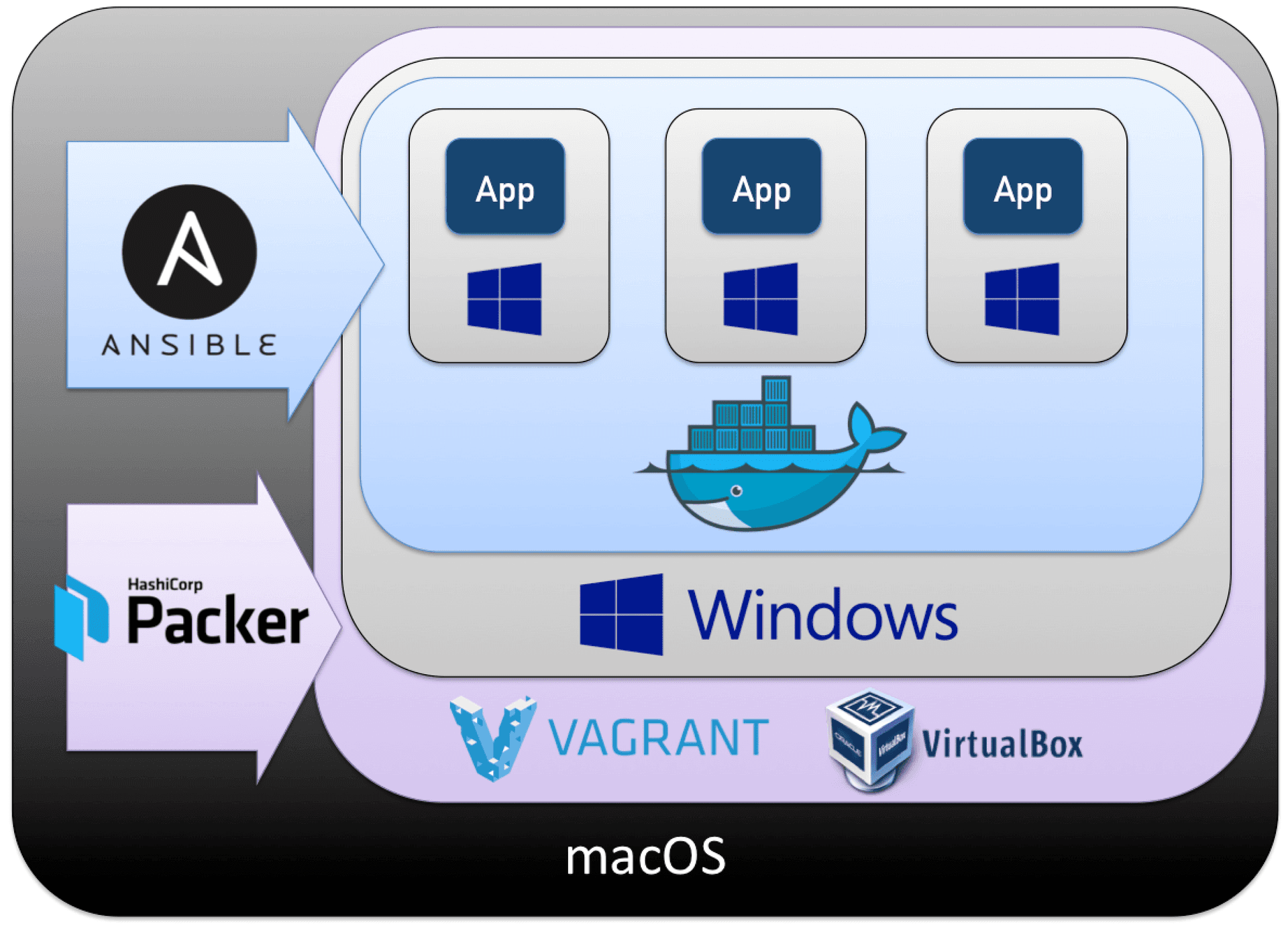 logo sources: Windows icon , Docker logo , Ansible logo , Packer logo , Vagrant logo , VirtualBox logo