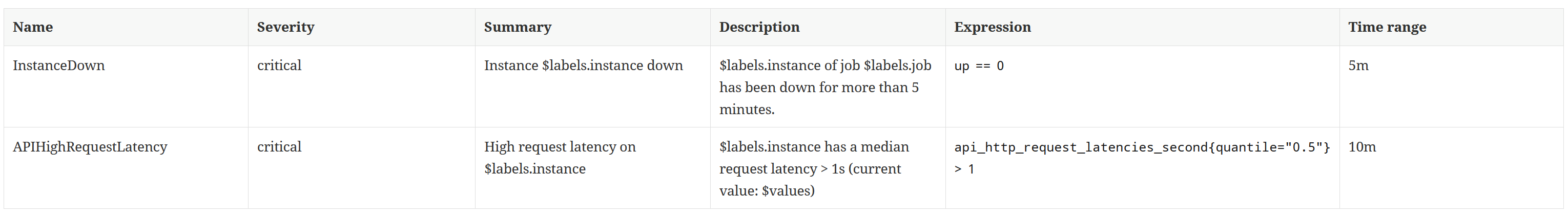 1apiVersion: monitoring.coreos.com/v1 2kind: PrometheusRule 3metadata: 4 name: {{ .Chart.Name }} 5 namespace: {{ .Release.Namespace }} 6 labels: 7 prometheus: example 8spec: 9 groups: 10 - name: example 11 rules: 12 - alert: InstanceDown 13 expr: up == 0 14 for: 5m 15 labels: 16 severity: critical 17 annotations: 18 summary: "Instance {{ $labels.instance }} down" 19 description: | 20 {{ $labels.instance }} of job {{ $labels.job }} 21 has been down for more than 5 minutes. 22 - alert: APIHighRequestLatency 23 expr: api_http_request_latencies_second{quantile="0.5"} > 1 24 for: 10m 25 labels: 26 severity: critical 27 annotations: 28 summary: "High request latency on {{ $labels.instance }}" 29 description: | 30 {{ $labels.instance }} has a median request latency 31 > 1s (current value: {{ $value }}s)