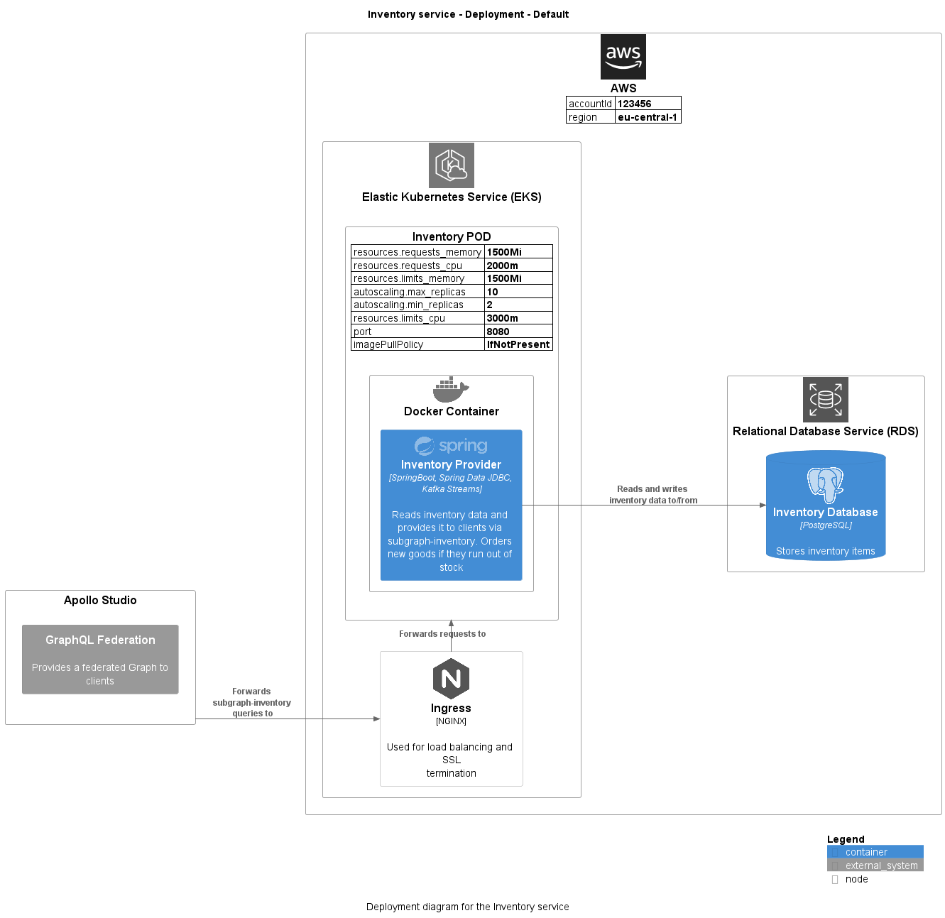 Another source for documentation-relevant information can be deployments, as long as they are described in a parsable format. Therefore, let's assume the following deployment of the Inventory Service is configured via Helm