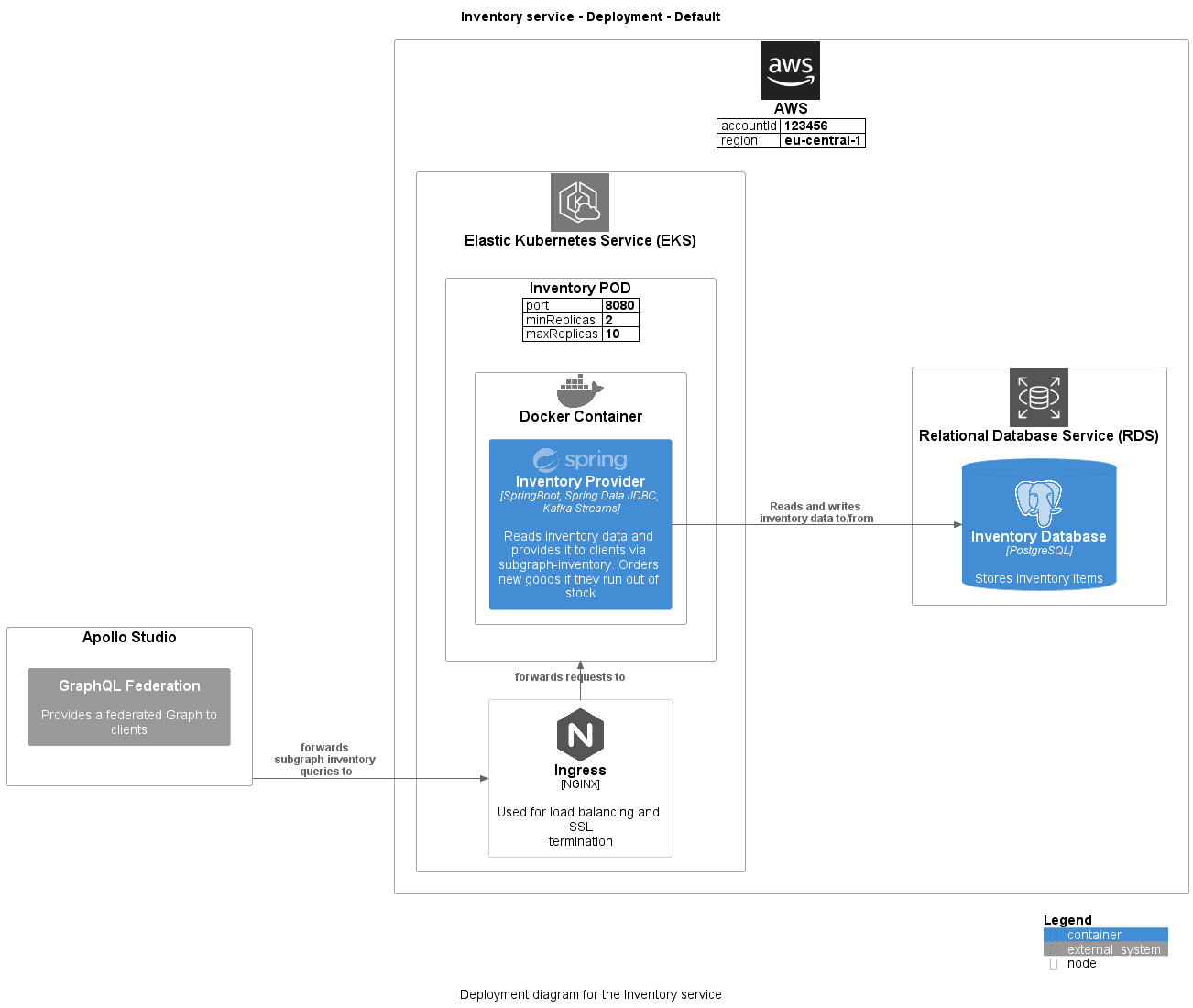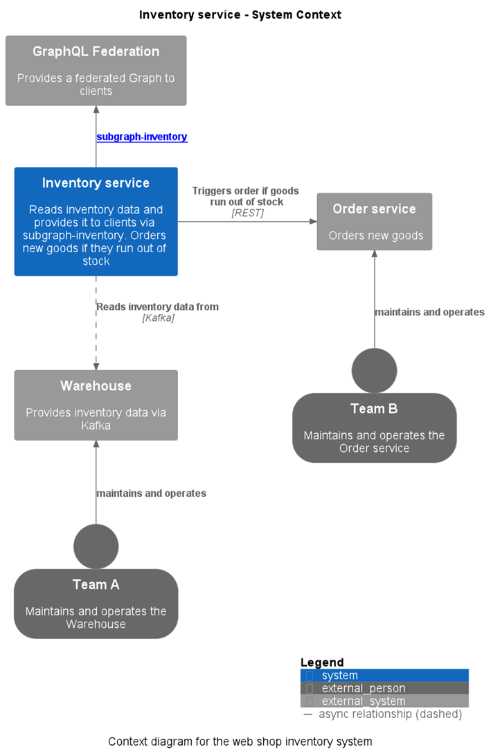 We will document a fictional application called “Inventory Service”. The Inventory Service is part of the backend of an online shop. It's responsible for providing meta information regarding the available goods like name, description and the available amount in stock. The Inventory Service receives this information from a system called "Warehouse" and provides the data to clients via GraphQL. Furthermore, if a good runs out of stock, the Inventory Service triggers a system called "Order Service" via a REST API call to order new goods.