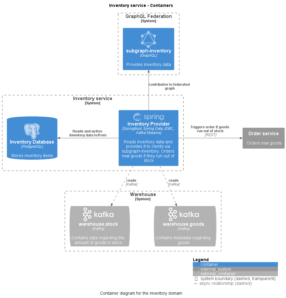 1object Systems { 2 3 val orderService = model.softwareSystem( 4 name = "Order service", 5 description = "Orders new goods", 6 location = Location.External 7 ) 8 val warehouse = model.softwareSystem( 9 name = "Warehouse", 10 description = "Provides inventory data via Kafka", 11 location = Location.External 12 ) 13 14 val graphQlFederation = model.softwareSystem( 15 name = "GraphQL Federation", 16 description = "Provides a federated Graph to clients", 17 location = Location.External, 18 ) 19 20 val inventoryService = model.softwareSystem( 21 name = "Inventory service", 22 description = "Reads inventory data and provides it to clients" + 23 "via subgraph-inventory. Orders new goods if they run out of stock", 24 uses = listOf( 25 Dependency( 26 destination = graphQlFederation, 27 description = "subgraph-inventory", 28 link = "http://your-federated-graph/subgraph-inventory" 29 ), 30 Dependency( 31 destination = warehouse, 32 description = "Reads inventory data from", technology = "Kafka", 33 interactionStyle = InteractionStyle.Asynchronous 34 ), 35 Dependency( 36 destination = orderService, 37 description = "Triggers order if goods run out of stock", 38 technology = "REST" 39 ) 40 ), 41 link = "#container-view" 42 ) 43}