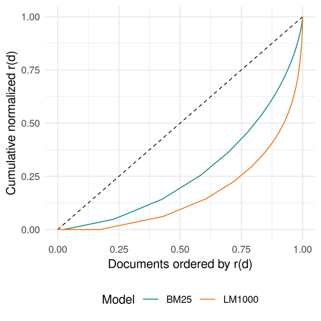 The lower Gini coefficients show that BM25 is generally the less biased retrieval model, which is in line with findings by other studies (for example ). This is also visible when we plot the Lorenz curves (\(c=100\)): The curve for LM1000 deviates much more from the diagonal than the curve for BM25.