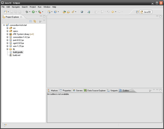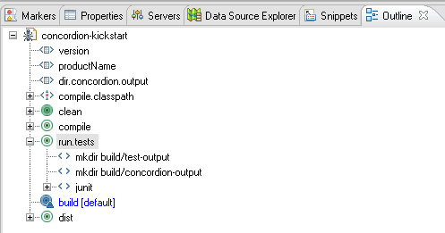 As my experience using Gradle is even smaller than my experiences using Ant I try the latter one. And luckily everything works out without any problems. After opening the build.xml build file you can use the Eclipse Outline-View to select the “run tests” task. This one is then executing the tests and writes the results to the workspace under “build/concordion-output”.