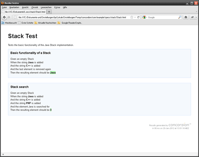 The generated report for a test run looks very much like the test description itself. Thus it is up to the developer of the test description how well this report looks like and how easy it is to read the tests. On the other hand there is really not much additional functionality or information offered. Our example results in the following report: