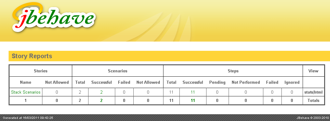 The following screenshot shows the report generated by JBehave when executing the tests from this example: