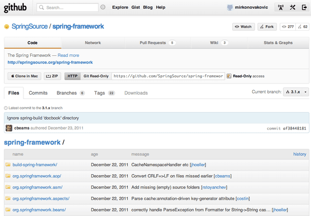 GitHub is easy to use and has an excellent Web UI. Projects can be created and cloned easily – you can for example create a local copy of the Springframework with just on Mouse click (there is also a nice native Mac App that you have to try out). Beside the version control service based on Git, GitHub provides some useful additional functionality like a Wiki, a simple Bugtracking tool and a collaboration tool for code reviews. Especially the reviewing functionality is a big additional value for software projects. Also the wiki has some nice features – it can be viewed locally on the development machine and can be branched and merged like other sources with Git. The bugtracking will be suitable for small projects but is a little bit too lightweight for bigger teams.