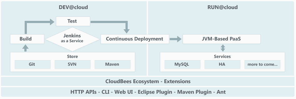 An alternative to CloudBees is Bamboo OnDemand from Atlassian, that has a great integration into the whole Atlassian product suite and offers some nice features to integrate with Amazon Web Services, so that you can setup a test server in the Amazon cloud. Bamboo also has some Continuous Deployment features that will help teams to implement DevOps in the organization.
