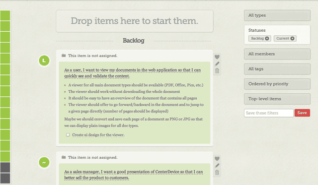 A new and intelligent alternative to Jira, especially for “startup-like” projects is Sprint.ly . With Sprint.ly the product (backlog) is the center of the whole application. You can create user stories, tasks, bugs and test and prioritize them by drag&drop the items in the UI. Sprint.ly also offers a task board and the ability to estimate the size of an item using t-shirt sizes (S, M, L, XL). The UI of Sprint.ly is really exciting, because of a lean but nice design and a great usability that also supports keyboard shortcuts in the lastest release. Sprint.ly also integrates with GitHub, so that a developer can for example close a ticket by just putting a special “command into the comment” of a commit to the repository. Sprint.ly supports creation of items by sending e-mails to the system and I am quite confident that with the ReST API there will be more integrations soon. The process behind Sprint.ly is agile, but neither Scrum nor Kanban – it takes the best of both worlds and offers a unique approach that helps to get things done quickly. I personally like the approach combined with this great tool, but everybody should test if Sprint.ly fits into his