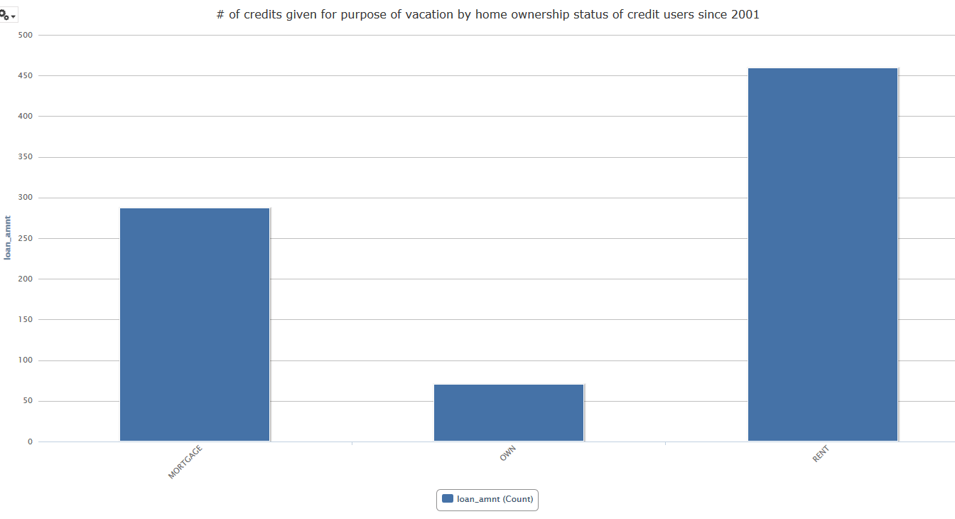 The chart above shows the number of credits loaned by LendingClub for purpose of vacation since 2007, differenced by the home ownership state of the credit user. A little more than 800 credits (816, to be exact) were granted for people indicating that they would use the money to go on vacation; the vast majority of whom already had regular obligations to fulfill – rent or mortgage payments. Interesting…