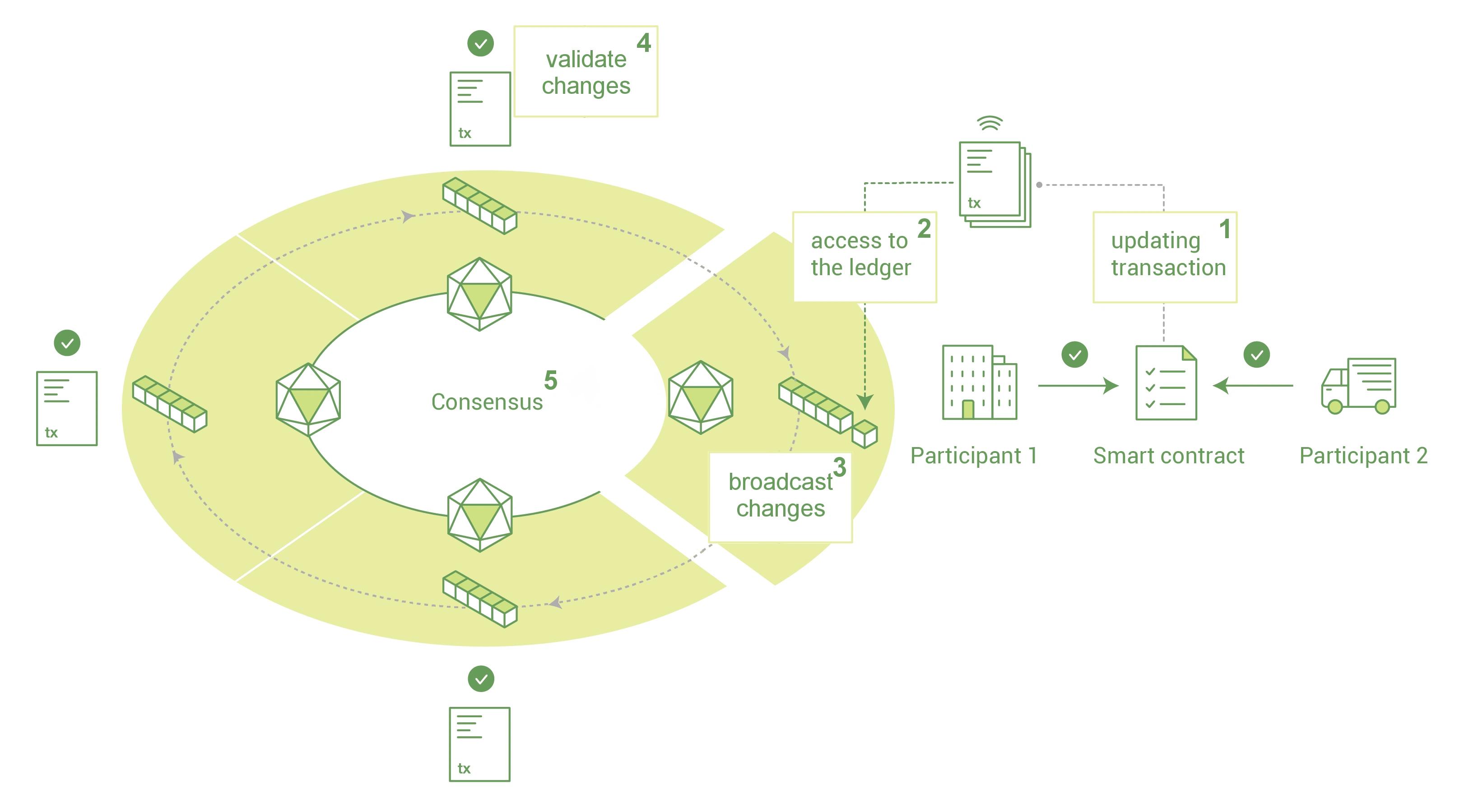 The concept of the chain code is intended to implement business logic based on the assets and their owners. This can be used to implement rules in languages such as Go, Java or Node.js that define read rights or modifications to assets. Executing a chain code function can read and return assets and/or create and modify assets and store them in the local ledger database. After the local persistence of the changes on a node, the changes are proposed to the network (“endorsement”) and inserted into the blockchain after acceptance by the other organizations. Chain code can be compared to Smart Contracts in the context of Ethereum or other public blockchain platforms.
