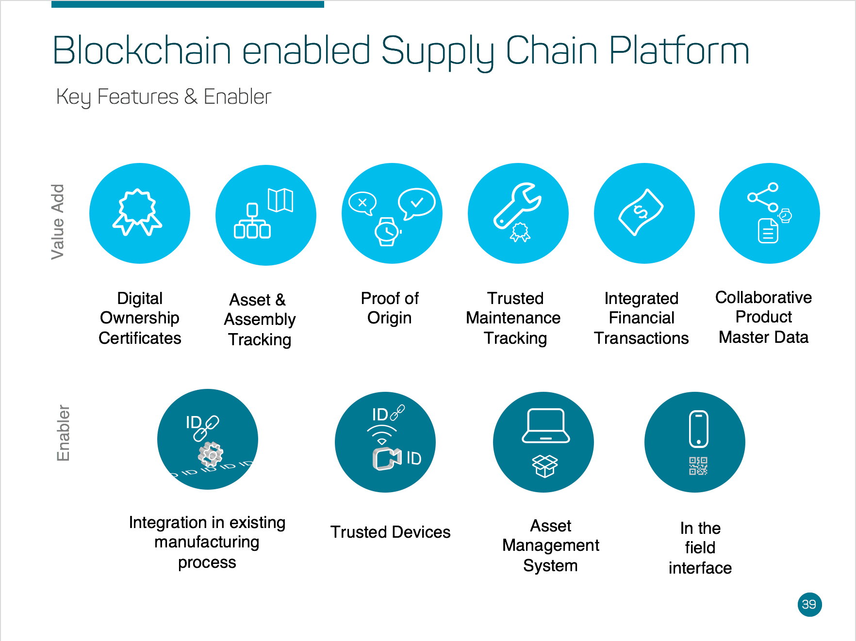 With this in mind, we started to dig deeper into this problem domain and strived to create a solution-approach that will create added value for the industry. The feature set of the implementation roadmap is divided into value-adding and enabling features.