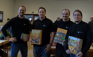 “Dr. codecentric und seine kranken Pfleger”, (codecentric, M.D. and his sick attendants) the codecentric board game team, Andreas Ebbert-Karroum, Torsten Rodemann, Marc Clemens and Fabian Lange (left to right) competed in Dinslakenhighly motivated for the qualification for the national board game championship this Saturday. After having been quite successful last year at our first attempt, our expectations were high, despite the lack of proper training.