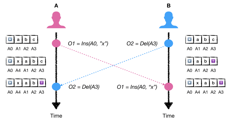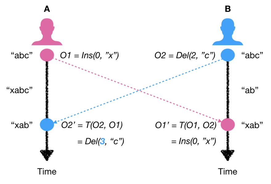 Consider the following example as illustrated in the figure below: Client A and B are both concurrently modifying a document “abc”. A wants to insert the character “x” at position 0 (O1 = Ins(0, “x”)). At the same time, B is deleting character “c” at position 2 (O2 = Del(2, “c”)).
