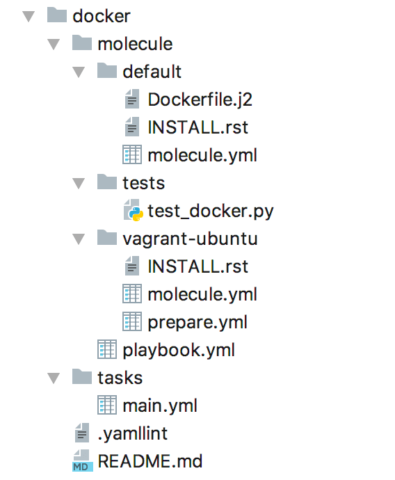 As Docker is the default infrastructure provider in Molecule, I simply renamed default into vagrant-ubuntu. Then I created a new directory with the name default to contain all the Docker configuration for Molecule. This results in the following project structure which resembles Molecule´s best practice on how to use multiple scenarios inside the same Ansible role: