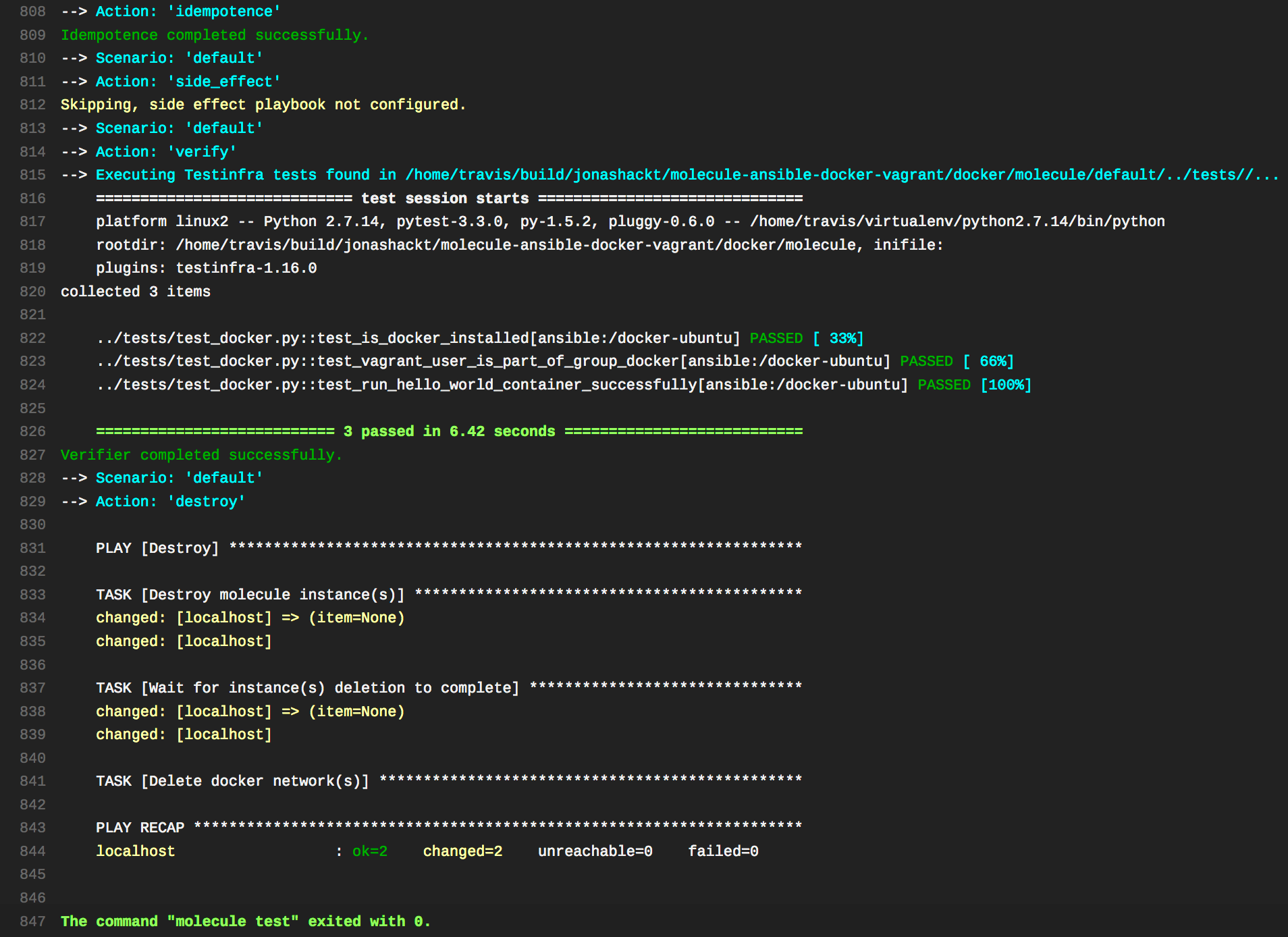 As molecule tests are executed from within the role´s directory, we cd into it and then run Molecule via molecule test. And that´s it! Now every code commit pushed into our GitHub repository issues a new TravisCI build that runs our full Testinfra test suite with the help of Molecule: