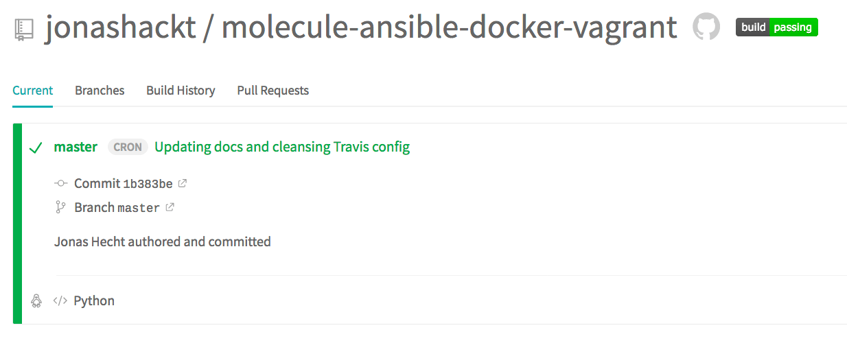 Having a cron job configured, TravisCI now automatically runs our Molecule test suite every week! You can see a small cron logo at your TravisCI job log like this: