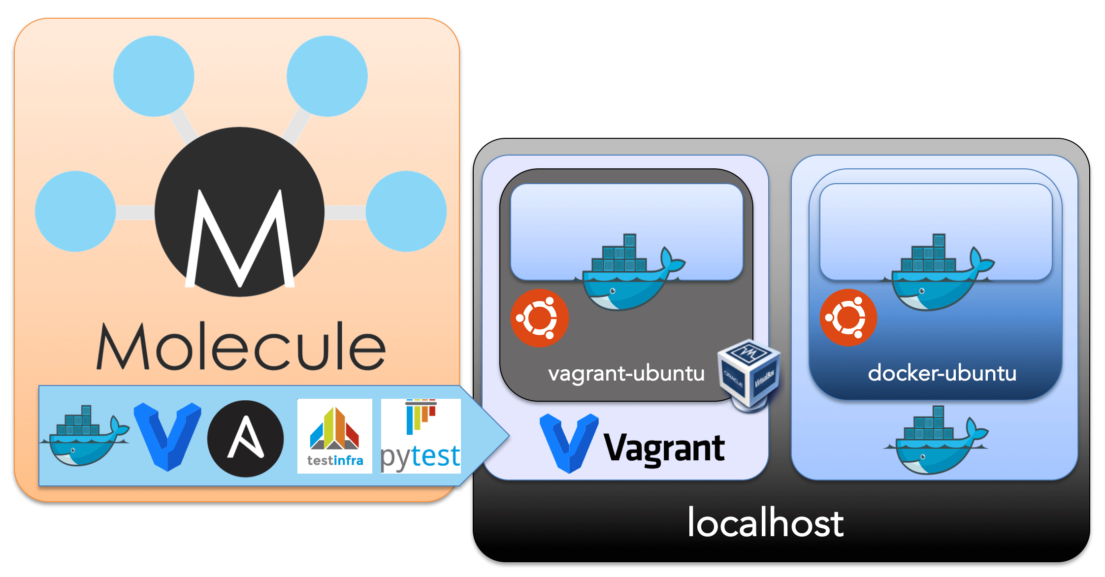 logo sources:Molecule logo, Vagrant logo , VirtualBox logo , Ansible logo , Docker logo , Testinfra logo , pytest logo , Ubuntu logo