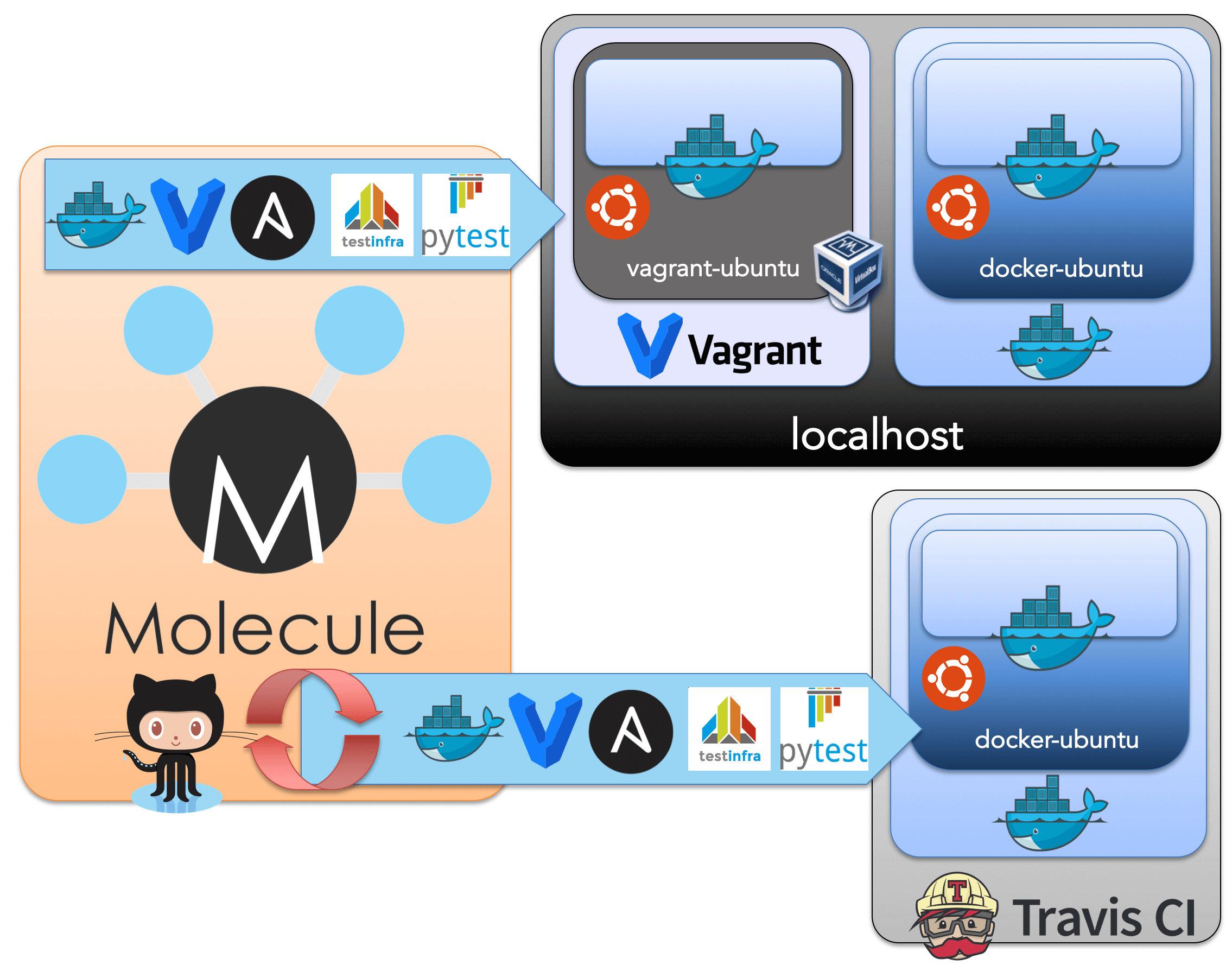 logo sources: Molecule logo, Vagrant logo , VirtualBox logo , Ansible logo , Docker logo , Testinfra logo , pytest logo , Ubuntu logo , TravisCI logo