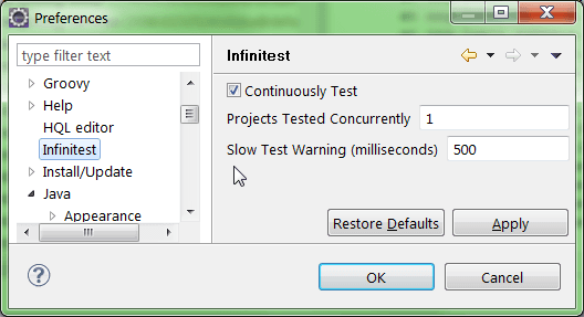 In addition, it is possible to revert code changes that have been made since the last known green state. Settings that can be configured via preference dialogs and are much more extensive than in Infinitest. Developers can disable continuous testing at the project and package levels. Unfortunately, settings are stored internally within Eclipse instead of inside the project folder, so that you cannot add them to version control and share them between team members.