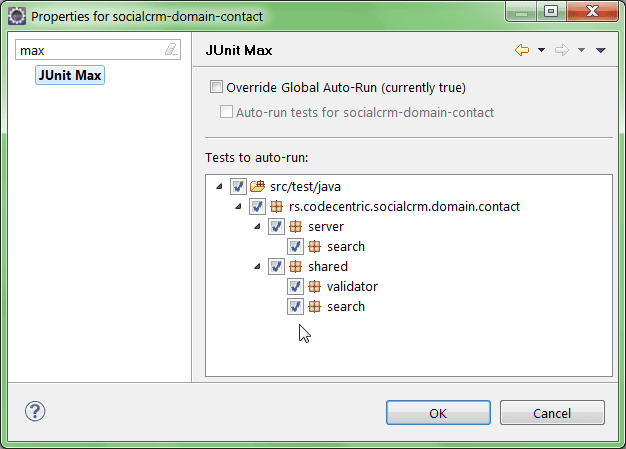 Alternative programming languages are not supported by JUnit Max. Corresponding tests are ignored completely. Also changes on code under test written in other languages are not detected, even if the code is covered by Java JUnit tests. Sadly, the plugin always stopped working after a short time showing an EOFException in the console view, until the next restart of Eclipse. This seems however to be a local problem with my machine (it’s always the same) – my collegues didn’t have that problem.