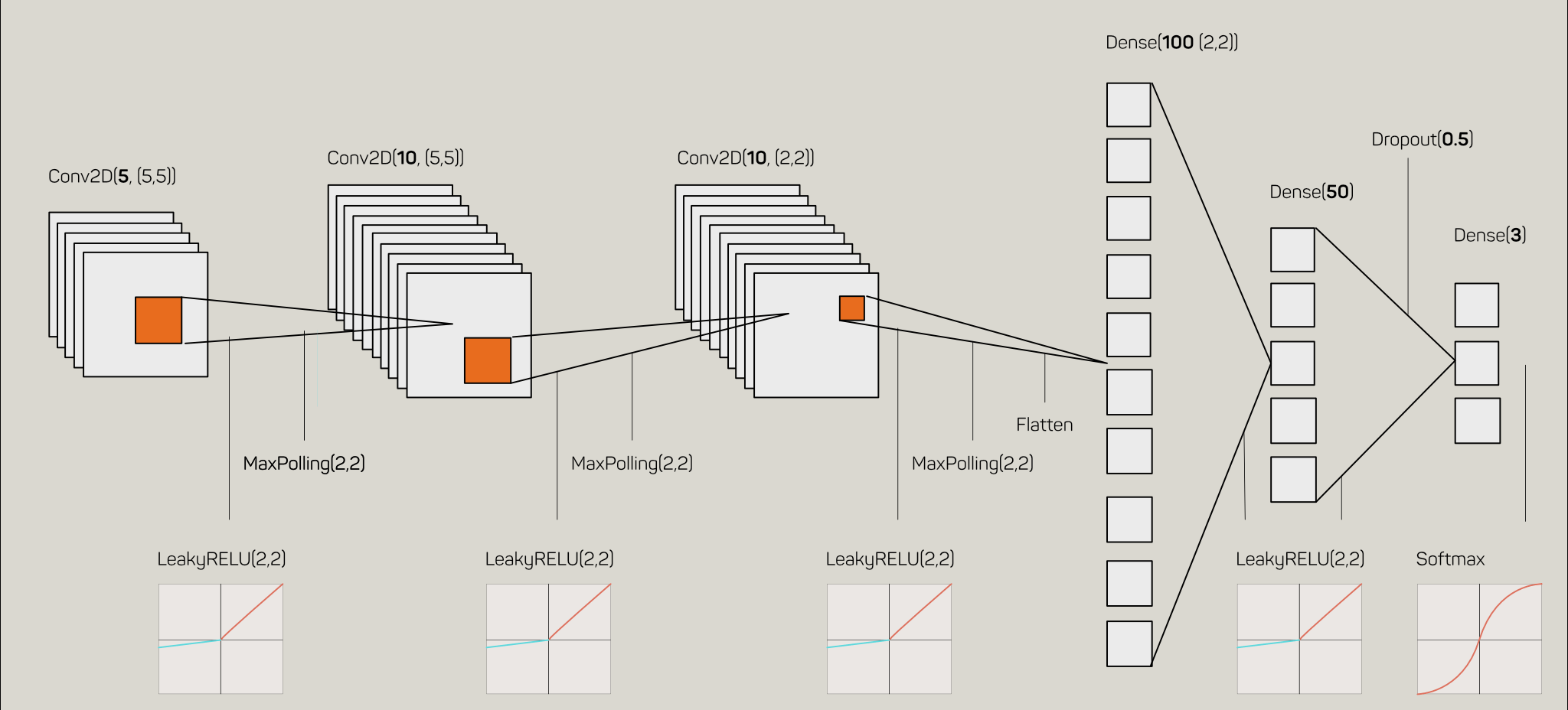 1model = Sequential() 2model.add(Conv2D(5, KERNEL_SIZE, 3 input_shape=IMAGES_SHAPE, 4 data_format='channels_last', 5 kernel_initializer=KERNEL_INITIALIZER, 6 padding=PADDING)) 7model.add(LeakyReLU(LEAK_ALPHA)) 8model.add(MaxPooling2D(pool_size=MAX_POOLING_POOL_SIZE)) 9model.add(Conv2D(10, KERNEL_SIZE, 10 kernel_initializer=KERNEL_INITIALIZER, 11 padding=PADDING)) 12model.add(LeakyReLU(LEAK_ALPHA)) 13model.add(MaxPooling2D(pool_size=MAX_POOLING_POOL_SIZE)) 14model.add(Conv2D(10, KERNEL_SIZE, 15 kernel_initializer=KERNEL_INITIALIZER, 16 padding=PADDING)) 17model.add(LeakyReLU(LEAK_ALPHA)) 18model.add(MaxPooling2D(pool_size=MAX_POOLING_POOL_SIZE)) 19model.add(Flatten()) 20model.add(Dense(100)) 21model.add(LeakyReLU(LEAK_ALPHA)) 22model.add(Dense(50)) 23model.add(LeakyReLU(LEAK_ALPHA)) 24model.add(Dropout(DROPOUT)) 25model.add(Dense(NUMBER_OF_CLASSES)) 26model.add(Activation(ACTIVATION_LAYER_FUNCTION)) 27 28model.compile(loss=LOSS_FUNCTION, 29 optimizer=OPTIMIZER, 30 metrics=[metrics.categorical_accuracy]) 31model.summary()