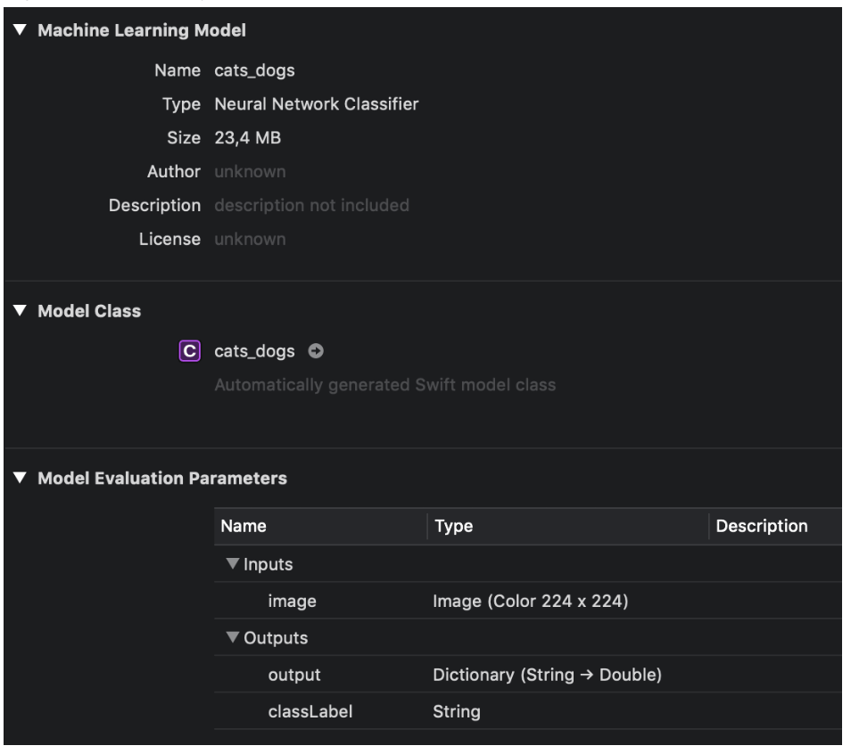 For integration into an app, the file must be added to the Xcode project. In XCode, you can see which model parameters are given for the input and output of the data. In our case, we need as input an RGB image with 224×224 pixels. The output of the model is the highest-probability label and a hashmap that contains the likelihood of the labels.