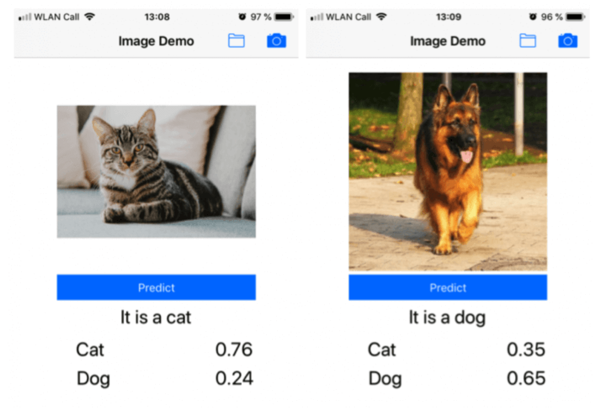 We are using a Keras model that can distinguish between dogs and cats. In the app, either a picture taken with the camera or removed from the photo library.