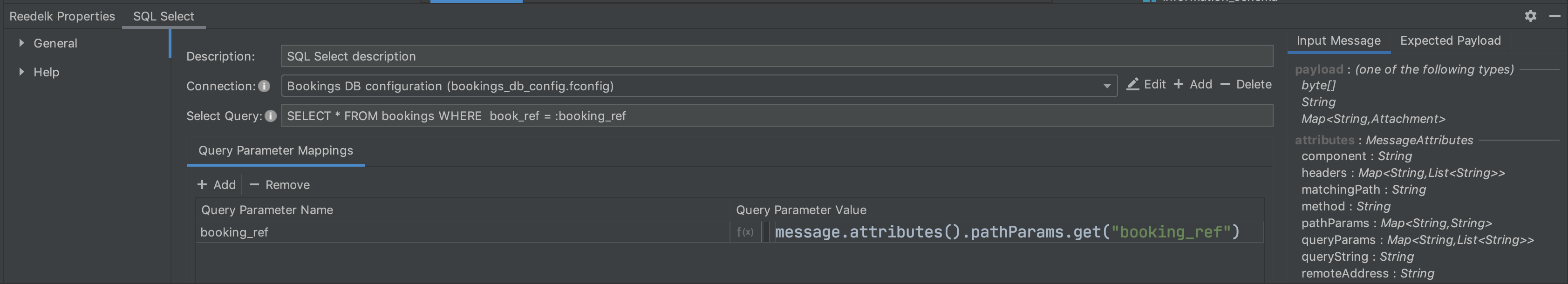 When the GET endpoint is queried, the database is relatively big. The table bookings contains over 2 million entries. The specification already contains the endpoint bookings/{booking_ref}, which can be used to query the booking for a specific booking reference. We can replace the existing mock with two components (SQL Select and Object-to-JSON), so this flow also returns a desired JSON as response. The select statement in the SQL Select component has to be configured according to the screenshot.