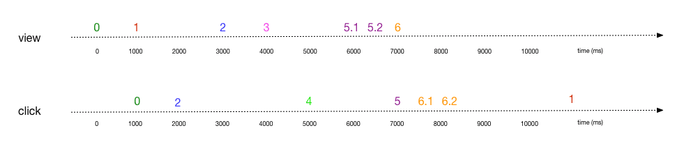 - there are two view events at distinct times, and a click event 1000 ms after the first view. The view events are denoted as 5.1 and 5.2