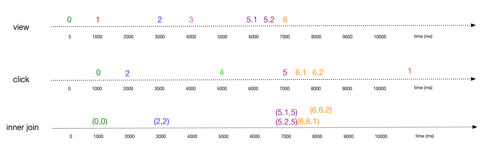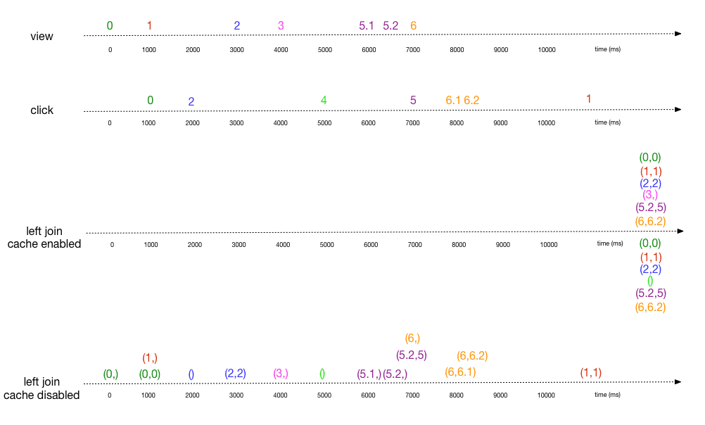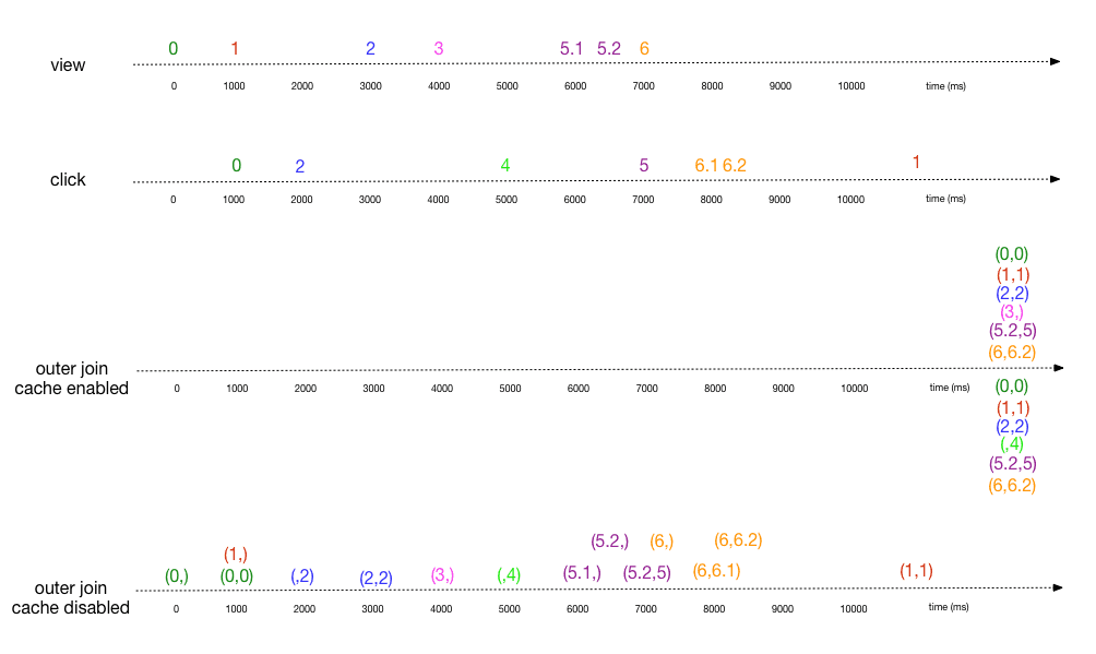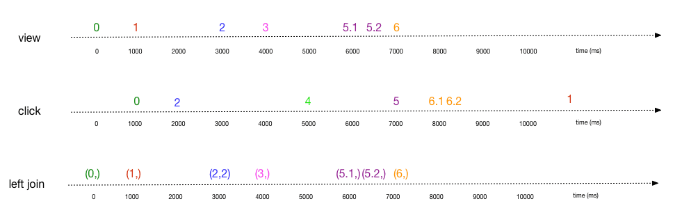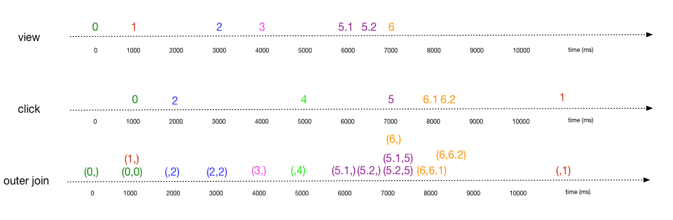 For scenario 0, an event is emitted once the view is processed. There is not click yet. When the click arrives, the joined event on view and click is emitted. For case 1, we also get two output events. However, since the events do not occur within the window, neither of these events contains both view and click. Scenario 3 appears in the output without a click, and the equivalent output is emitted for scenario 4. Scenario 5 produces 4 output events as there are two views that are emitted immediately and once again when they are joined against a click. Case 6 only produces 3 events as both clicks can be immediately joined against a view that arrived earlier.