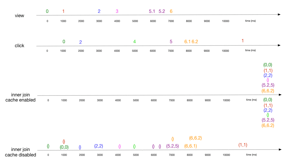 With caching disabled, cache semantics become a lot clearer. Very interesting are scenarios 5 and 6 where the stateful nature of KTables can be observed – view 5.1 is missing as it is updated in the source table by 5.2 wheres we get two joined output for scenario 6 because while click 6.2 updates 6.1, the runtime was able to match 6.1 against view 6 before it was update.