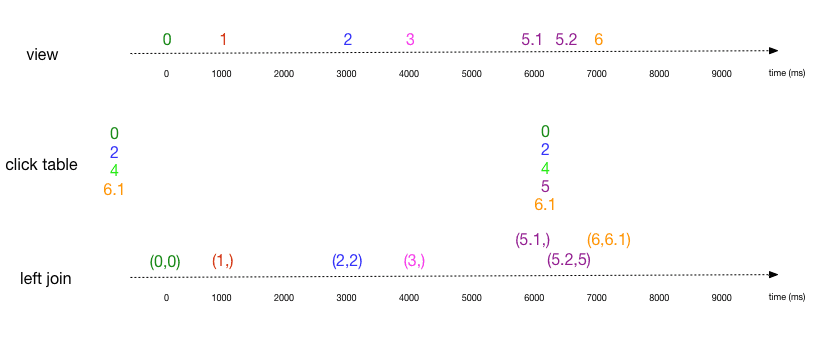 We’re simulating the output of an incoming stream joined against a table of clicks that initially is populated with events 0, 2, 4 and 6.1. Each incoming stream event is joined against that table and the result either contains both view and click or only the view if there is no click to join against. Between views 5.1 and 5.2, click event 5 is registered. While view 5.1 could not be joined against a click, this update means that view 5.2 can be joined. There is no issue with duplication as the result is a stream and not a table.