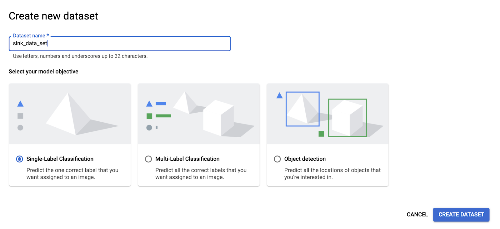Obtaining an AutoML vision model requires four simple steps: