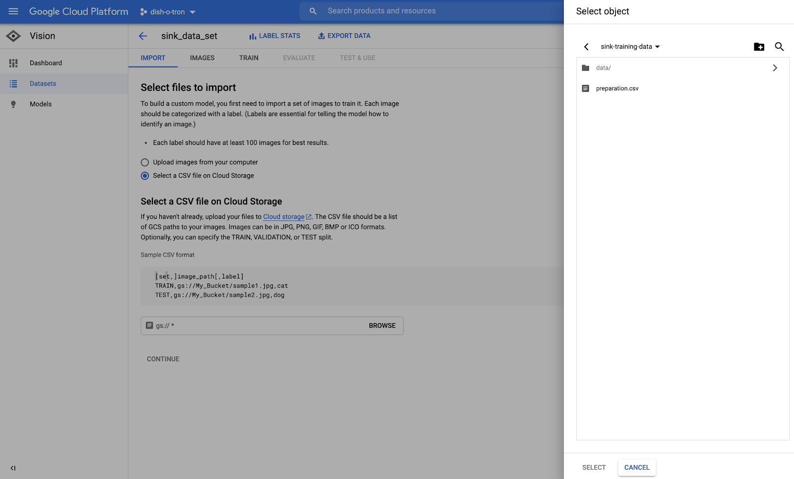 The starting point for using AutoML is creating a dataset. Because we already uploaded the data into a GCS bucket and prepared the CSV metadata file, we can create the dataset with a few clicks in the UI. After triggering the upload the import will take some time. This is your chance to ponder about life and do some meditation. You could also watch some cat videos – if this is your thing – or just grab a cup of coffee. While you are in the kitchen there might be an opportunity to collect another dirty dishes video. Don’t get mad – you already made fantastic progress on your journey to build dish-o-tron.