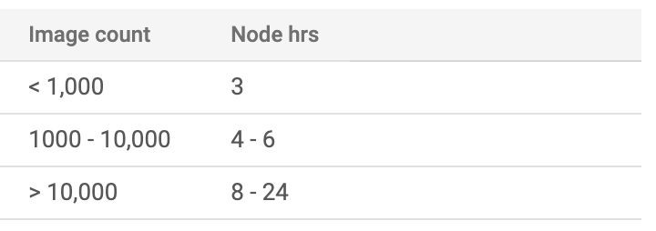 Please be aware that for each unit of time, Google Cloud uses 8 nodes in parallel, where each node is equivalent to a n1-standard-8 machine with an attached NVIDIA® Tesla® V100 GPU. Hence 8 node hours are approximately 1 “wall clock” hour. It is advisable to use the early stopping feature to ensure that training stops when further accuracy improvement is not possible. In the end, you pay only for the compute hours that are actually used.