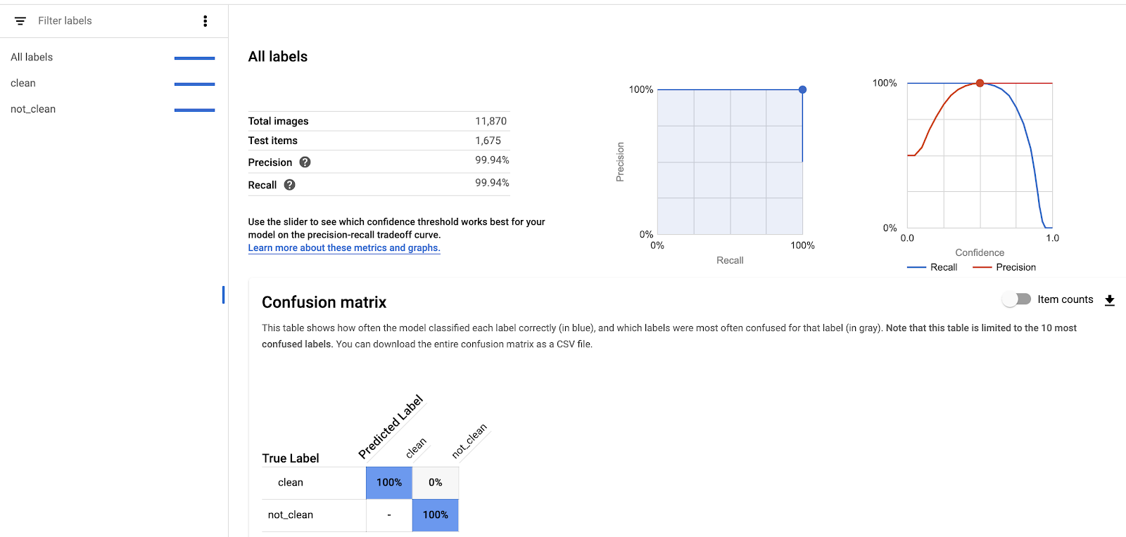 When the training is complete or at the latest, when you are back at your desk and observe that the training is complete, it is time for a few sanity checks of the model. Again this is possible with built-in validations of AutoML. If the accuracy is below 95% there is a strong reason to believe that something went wrong with the data or the data preparation.