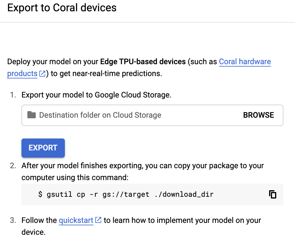 - Export the model (in a suitable format for the Coral device)