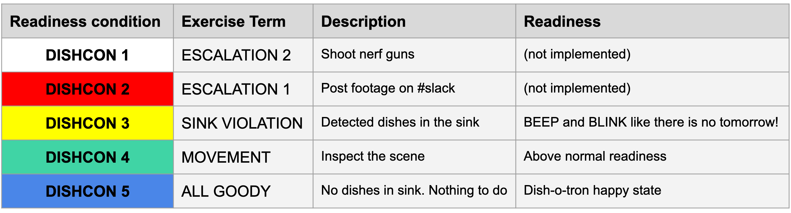 Because there is nothing we can do about this – we have to find another solution. The next reasonable step obviously is: Permanent control and punishment. That’s where dish-o-tron enters the arena. Inspired by the DEFCON levels of the United States Armed Forces we therefore propose the DISHCON levels (see this wikipedia article for reference.)