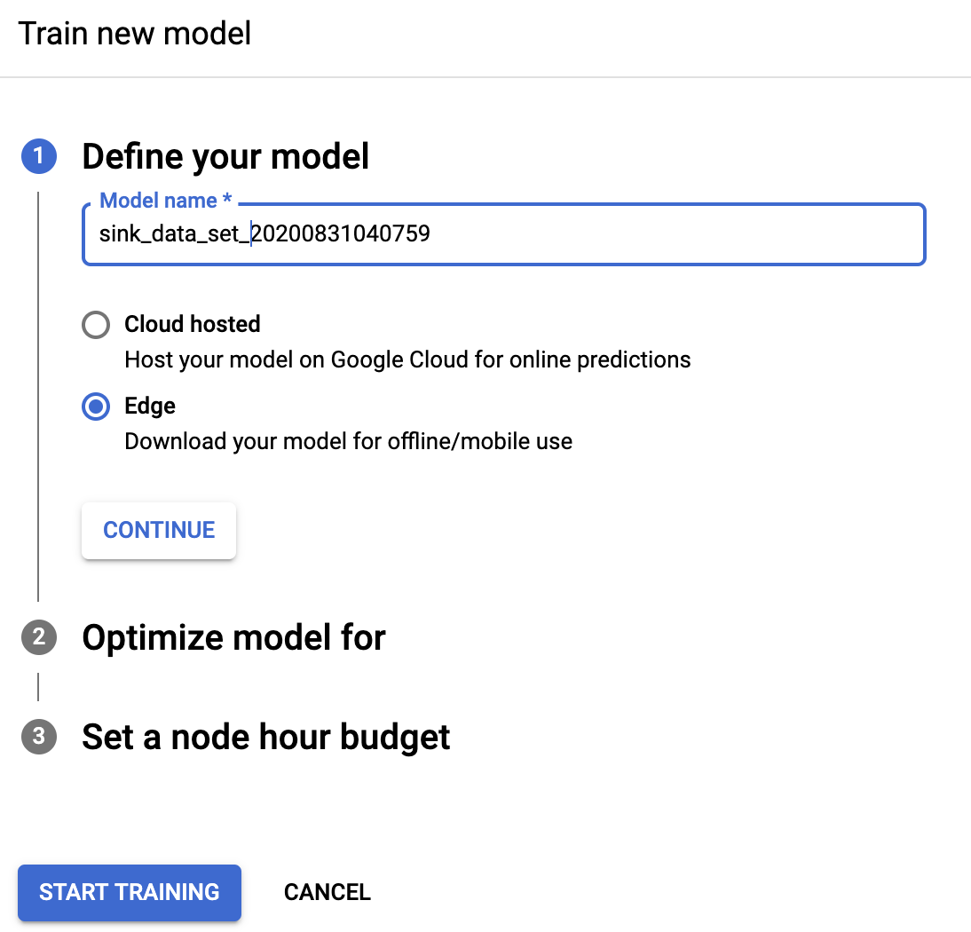 And now, finally, it is going to happen. We can start training the model with a few clicks in the UI. Because we plan on deploying the model on a Coral device, we choose the option “Edge”. For simplicity we select “optimize for best trade-off between latency and accuracy” and set (depending on the number of images) a suitable amount of node hours.