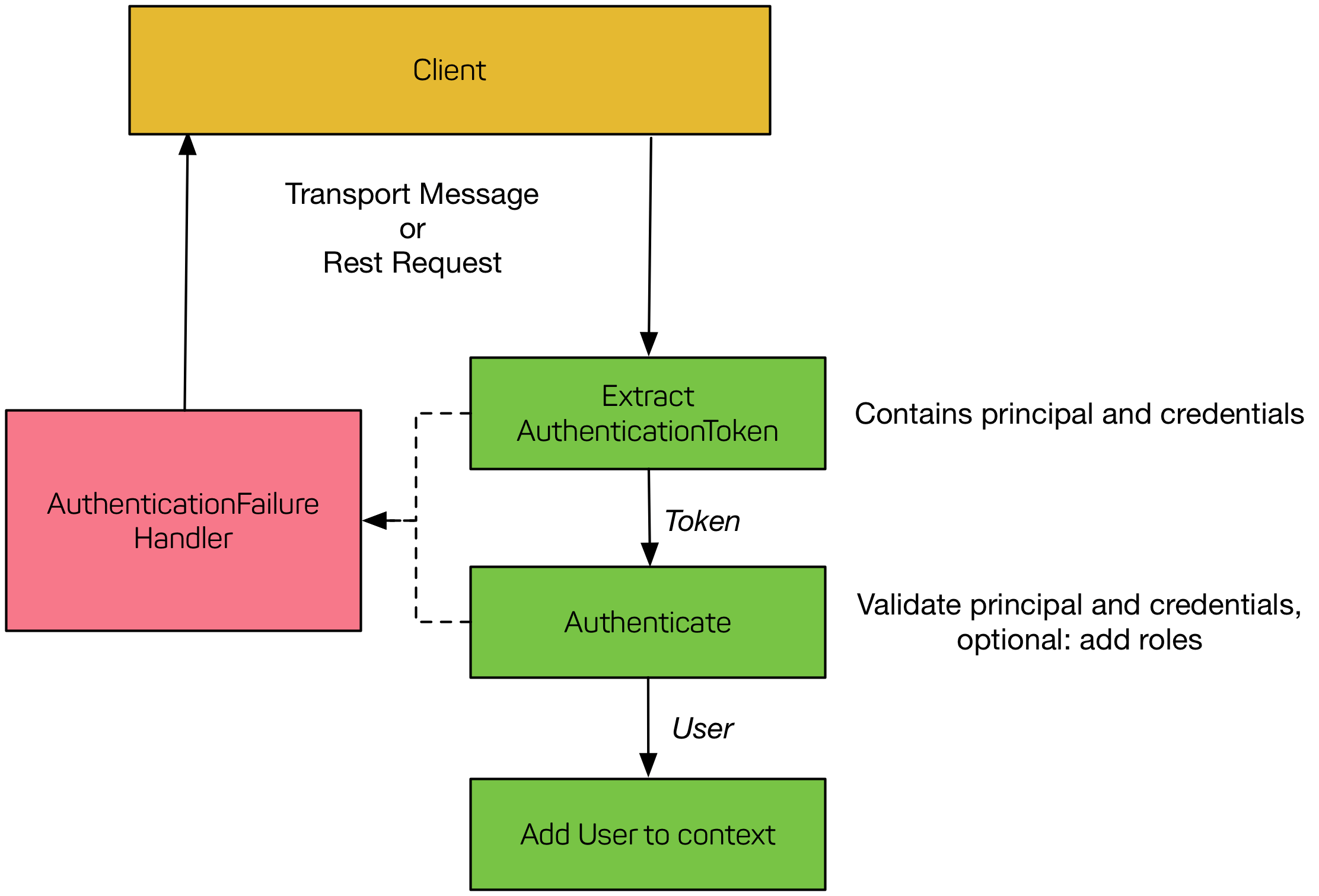 In a second step this Authentication Token needs to be validated. And again, the details on how to do this depend on the underlying authentication mechanism. For Kerberos we send the token to the Kerberos server and receive either a successful or failed authentication message (simplified). In case of success we extract the username from the token and put a user object into the context of the request. In case of a failure (if there is no token to extract or validation of the token fails) we throw a special exception. This exception is handled by the Authentication Failure Handler which forwards the failure to the client. The exception handled by the Authentication Failure Handler can contain additional commands for the client like “no authentication token, pls. send one” or “authentication token not complete, pls. send the rest of the token”. Once the token is successfully validated the user object will be put into the context what makes this request an authenticated request. In addition roles can also be added to the user to let Shield later perform authorization for that particular user.