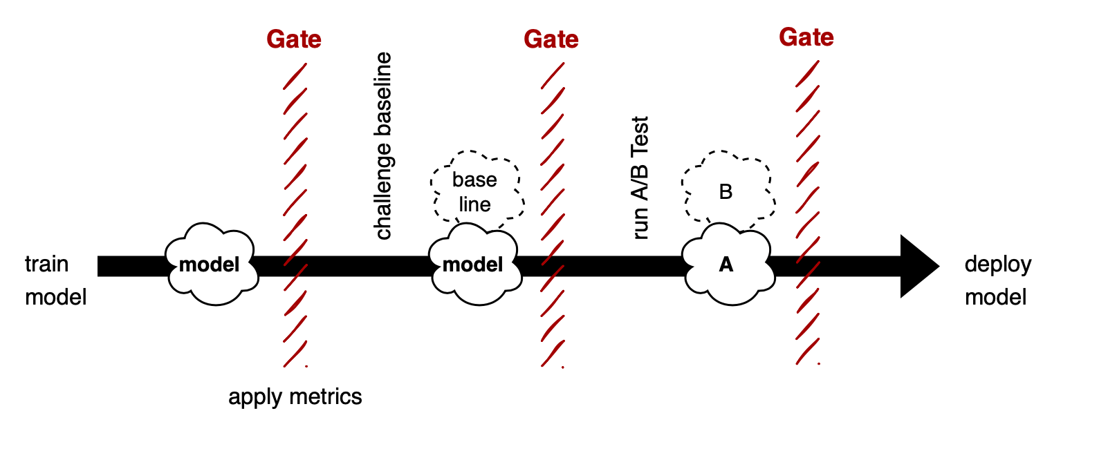 In addition, if further model approaches are to be tested, the last best model can of course also be compared with a new potentially better model. Thus A/B testing can also be integrated as a quality gate before deployment at the end of the pipeline. However, A/B tests might be time-consuming and therefore not always practical in an automated way.