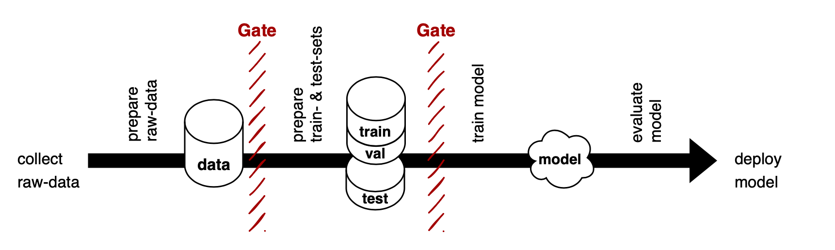 In the machine learning context, quality gates can be integrated as dedicated checks between the individual steps of an automated pipeline. Thus, they can track and monitor the quality of the artifacts in the process. Typical artifacts are the raw and processed data as well as the trained models.