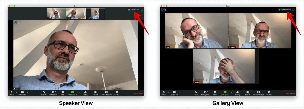 The next thing is really simple: I hope you already have discovered “Gallery View”? It allows to see everyone at the same time, not just the speaker in large and some tiny heads. Everyone’s head is the same size so you can somewhat better gauge their reactions (see below on the right):