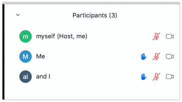and now you should see the participants lists on the right (if you are in full screen mode it is a pop-up window, but I prefer the list to be on the side). And in the lower left corner the participants see a blue hand: