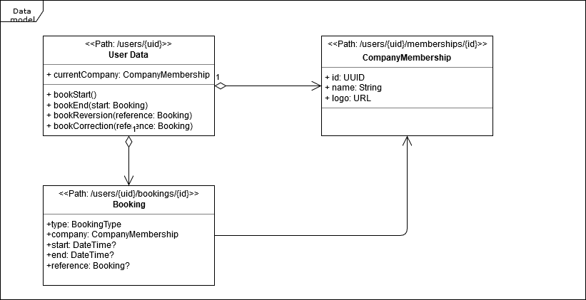 This model ties three entities together in a subtree of the firebase firestore. The user object itself stores user configuration (such as the current company context). It serves as the user preferences. The bookings collection aggregates all bookings. It allows reads and inserts, but blocks updates. The memberships collection permits user reads, but neither inserts nor modifications – otherwise the user would be able to add itself to any company. A privileged server component manages this collection instead.