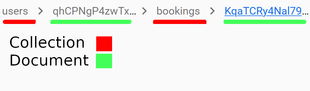 Firebase structures itself as a tree of collections and documents. A collection contains documents, and a document can contain fields and collections. We can read, write and edit documents by their path. The structure is always strictly alternating – a document always has collection children, and a collection always has document children.