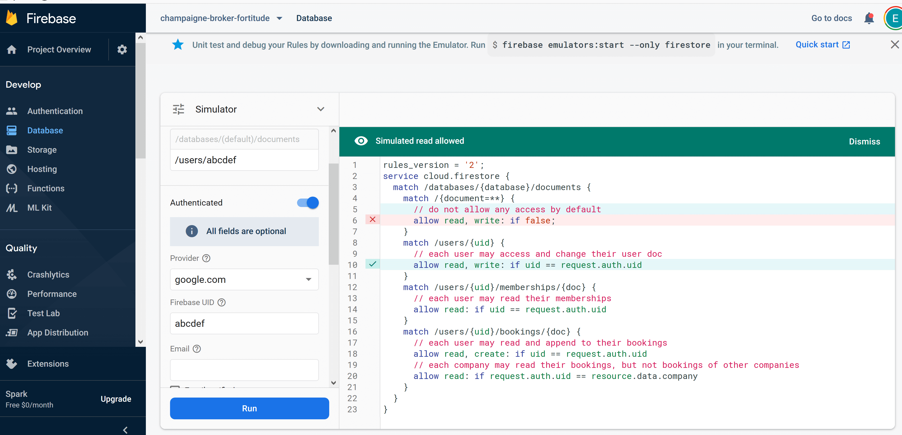 For developing and flight-testing security rules, the simulation environment provided as part of the firebase admin interface is invaluable. It allows to simulate different access attempts, and gives feedback which rules caused the attempt to succeed or fail respectively. You can find it in the firebase admin console, under the “database” heading.